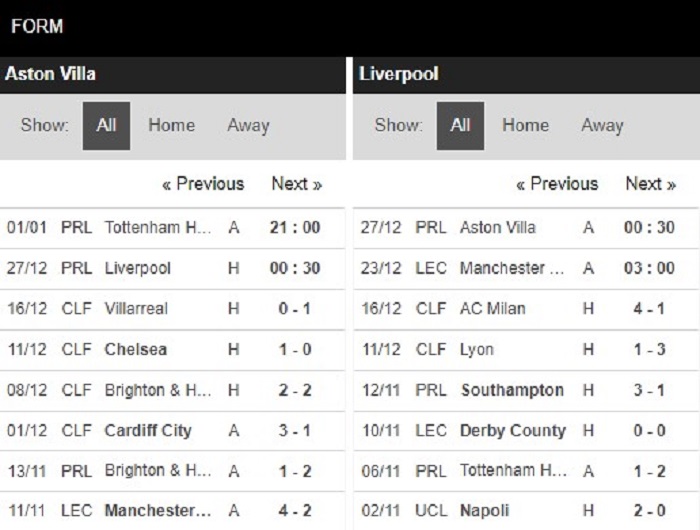 Chu kỳ lên xuống tỷ lệ kèo Aston Villa vs Liverpool