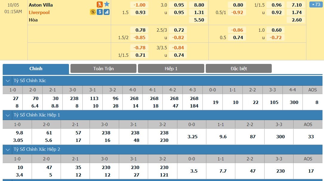 Tỷ lệ kèo cá cược bóng đá trực tuyến trận Aston Villa vs Liverpool