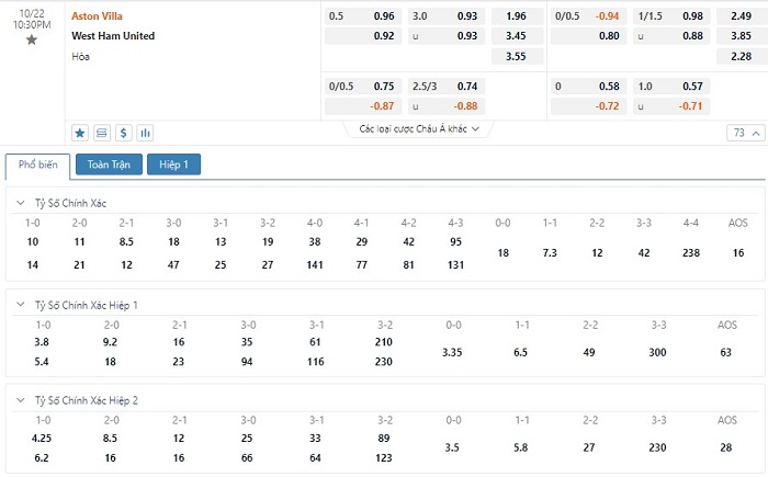 Tỷ lệ kèo cá cược bóng đá trực tuyến trận Aston Villa vs West Ham