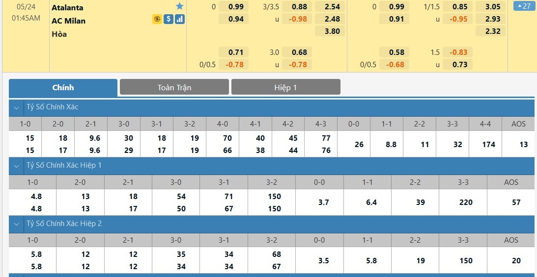 Tỷ lệ kèo cá cược bóng đá trực tuyến trận Atalanta vs AC Milan
