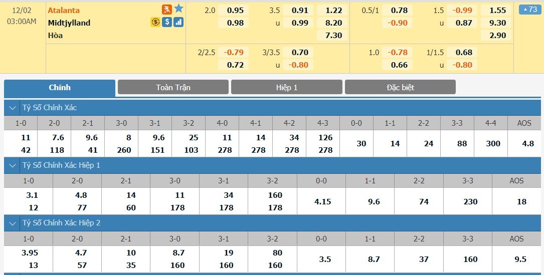 Tỷ lệ kèo cá cược bóng đá trực tuyến trận Atalanta vs FC Midtjylland