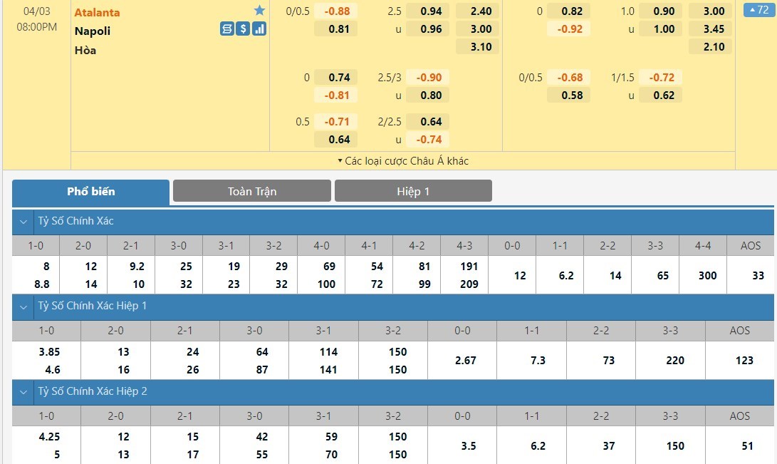 Tỷ lệ kèo cá cược bóng đá trực tuyến trận Atalanta vs Napoli