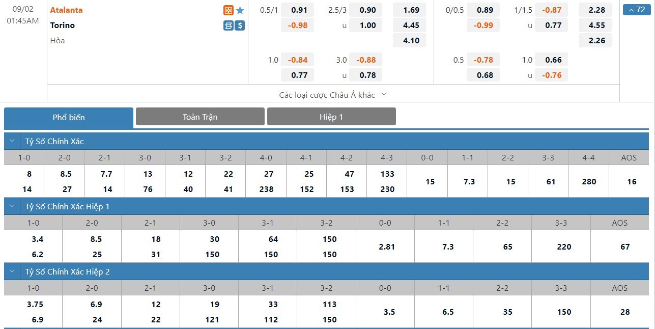 Xem tỷ lệ kèo cá cược bóng đá trực tuyến Atalanta vs Torino