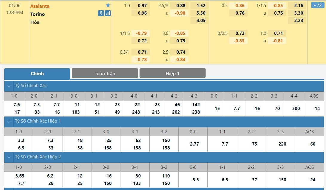 Tỷ lệ kèo cá cược bóng đá trực tuyến trận Atalanta vs Torino