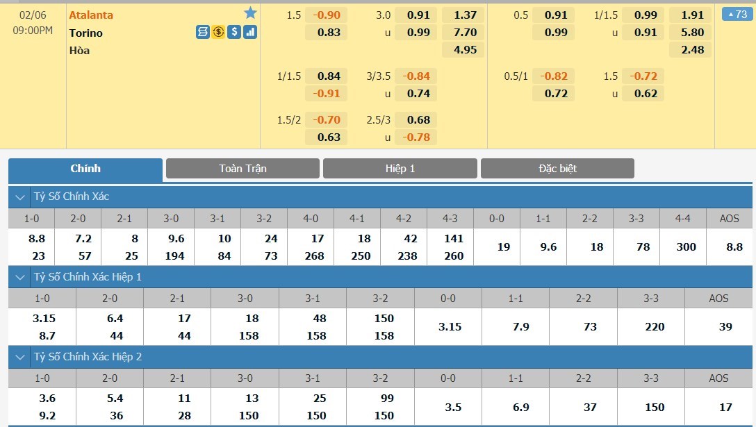 Tỷ lệ kèo cá cược bóng đá trận Atalanta vs Torino
