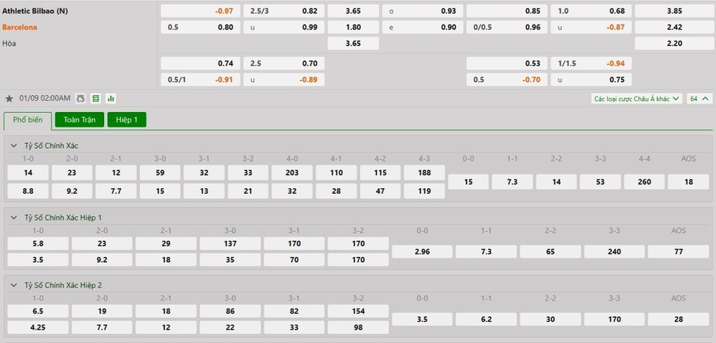 Tỷ lệ kèo cá cược bóng đá trực tuyến trận Athletic Bilbao vs Barcelona