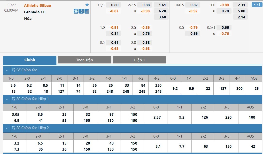 Tỷ lệ kèo cá cược bóng đá trực tuyến trận Athletic Bilbao vs Granada