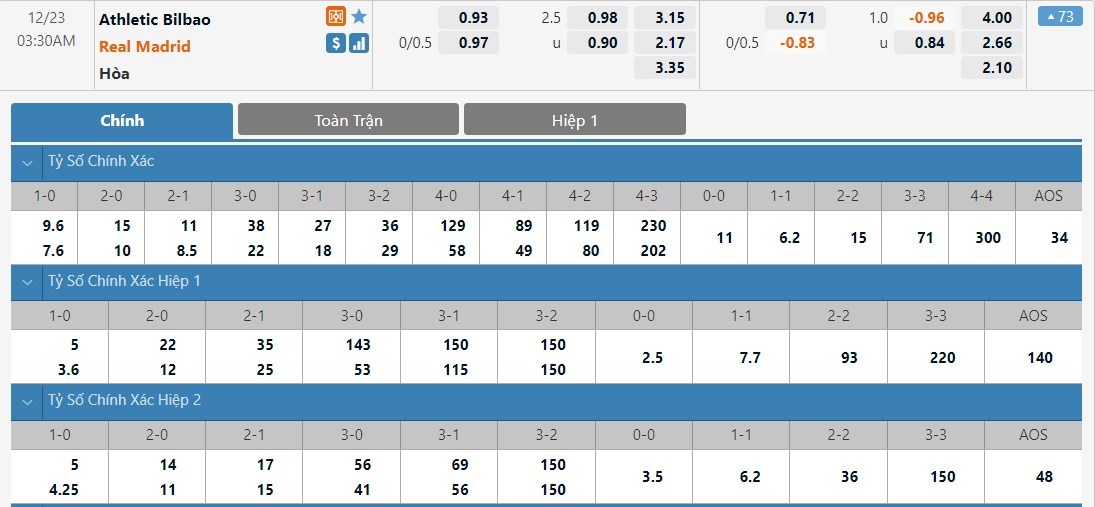 Tỷ lệ kèo cá cược bóng đá trực tuyến trận Athletic Bilbao vs Real Madrid