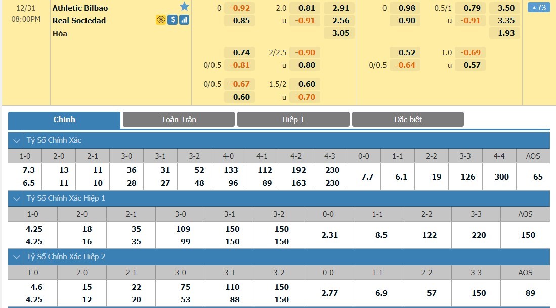 Tỷ lệ kèo cá cược bóng đá trận Athletic Bilbao vs Real Sociedad