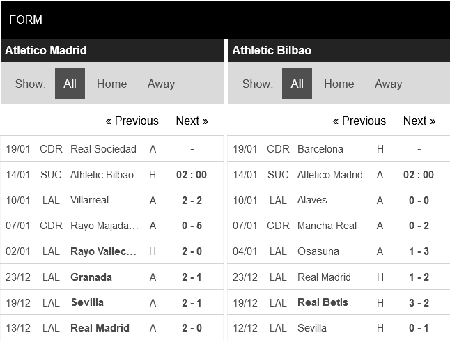 Atletico thi đấu khá tốt trong hiệp 1 mùa này với 6 trận thắng và 9 trận hòa trong 20 trận đã đấu. Trong khi đó, Bilbao chơi tệ hơn với 3 chiến thắng và 12 trận hòa trong 21 trận.