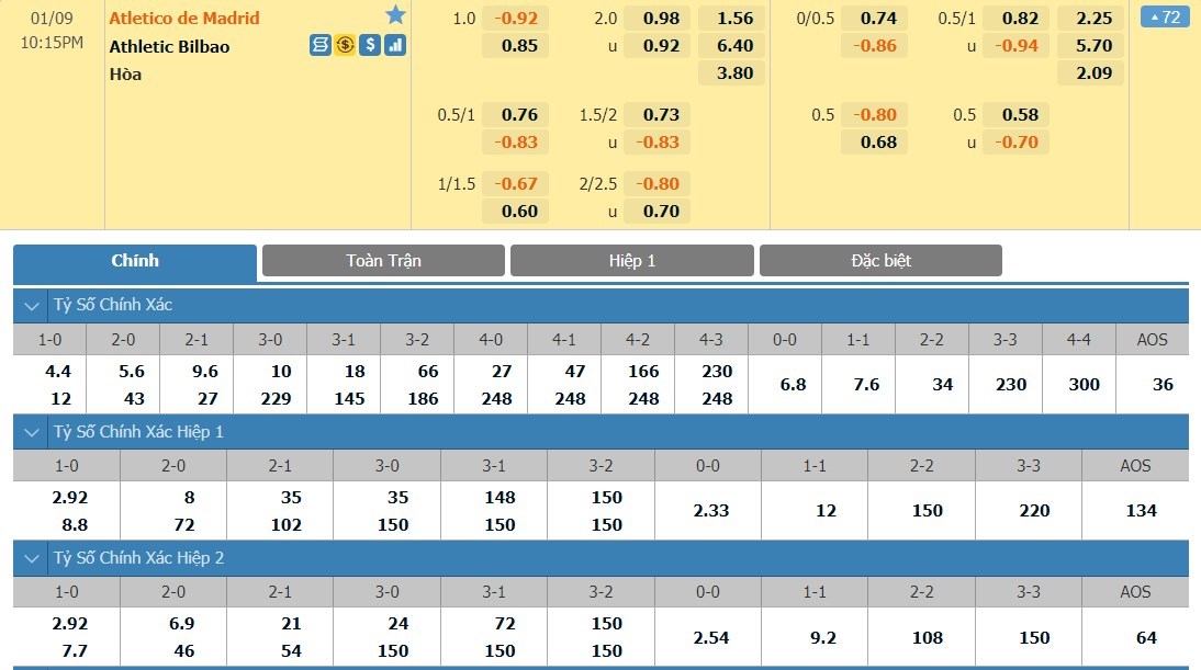 Tỷ lệ kèo cá cược bóng đá trận Atletico Madrid vs Athletic Bilbao