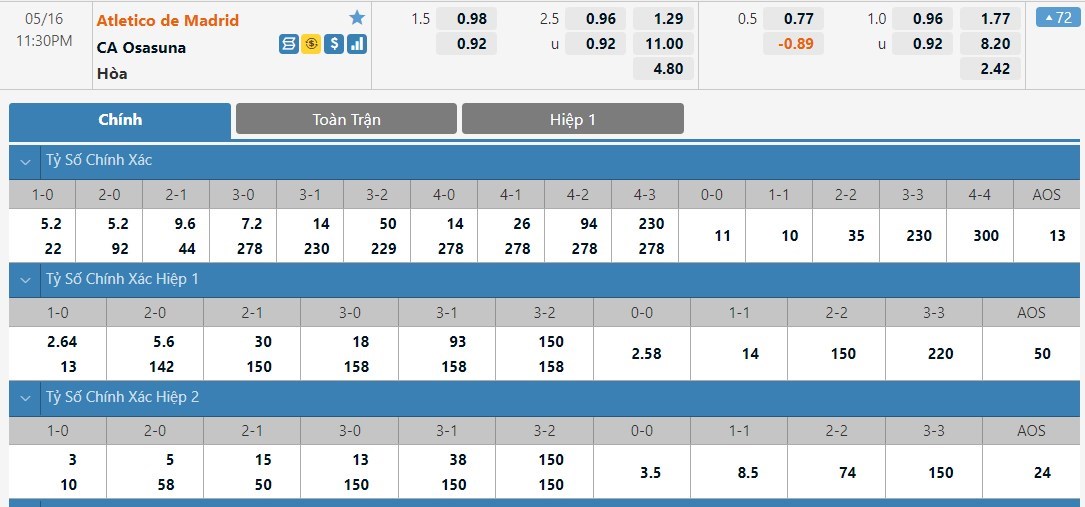 Tỷ lệ kèo cá cược bóng đá trận Atletico Madrid vs Osasuna