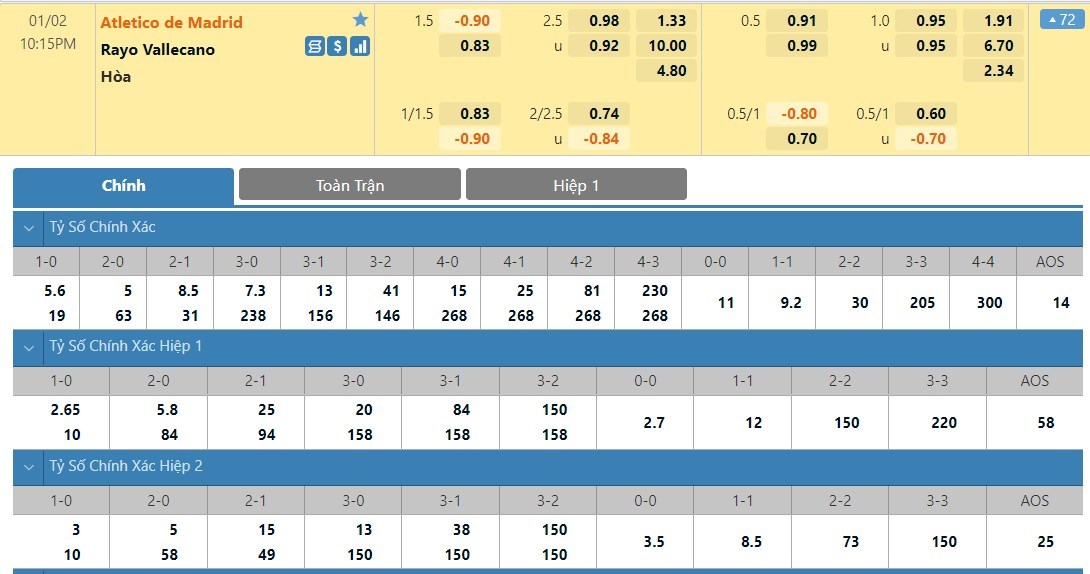 Tỷ lệ kèo cá cược bóng đá trực tuyến trận Atletico Madrid vs Rayo Vallecano