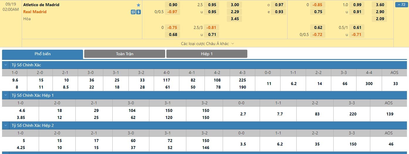 Xem tỷ lệ kèo cá cược bóng đá trực tuyến Atletico Madrid vs Real Madrid