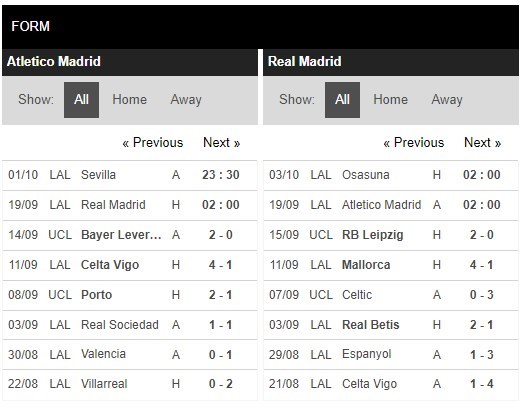 Thống kê phong độ Atletico Madrid vs Real Madrid