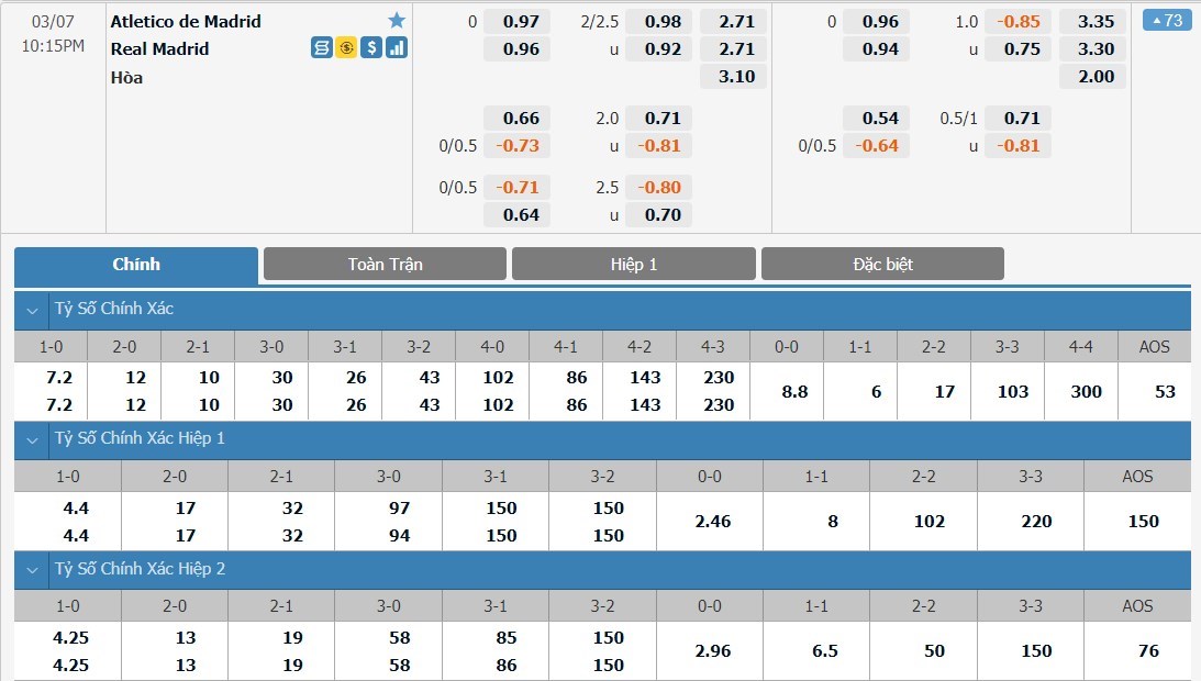 Tỷ lệ kèo cá cược bóng đá trận Atletico Madrid vs Real Madrid