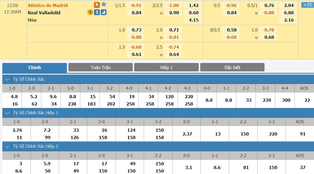 Tỷ lệ kèo cá cược bóng đá trận Atletico Madrid vs Real Valladolid