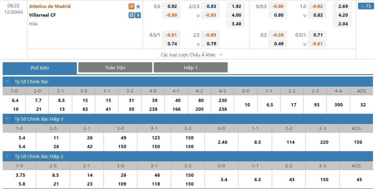 Xem tỷ lệ kèo cá cược bóng đá trực tuyến Atletico Madrid vs Villarreal