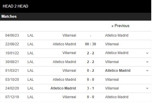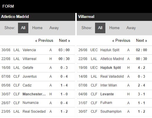 Thống kê đối đầu Atletico Madrid vs Villarreal