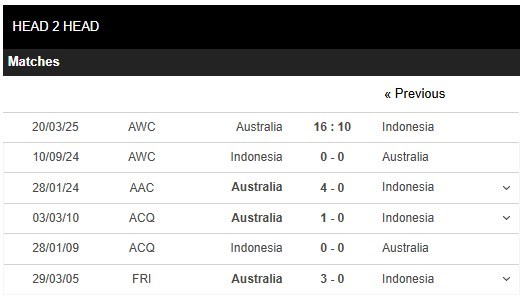 Thống kê đối đầu Australia vs Indonesia