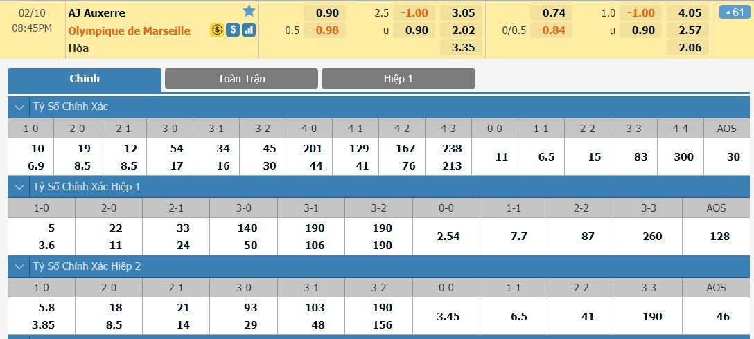 Tỷ lệ kèo cá cược bóng đá trận Auxerre vs Marseille