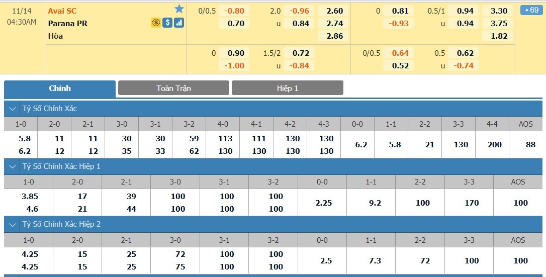 Tỷ lệ kèo cá cược bóng đá trận Avai vs Paraná Clube