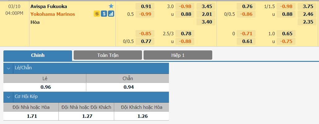 Tỷ lệ kèo cá cược bóng đá trận Avispa Fukuoka vs Yokohama F.Marinos