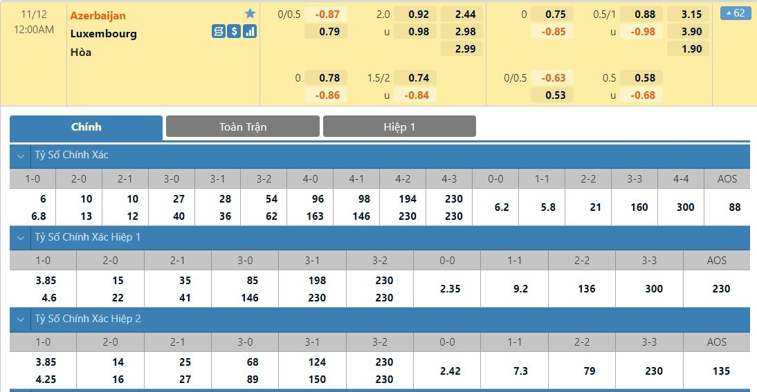 Tỷ lệ kèo cá cược bóng đá trận Azerbaijan vs Luxembourg