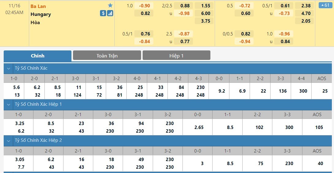 Tỷ lệ kèo cá cược bóng đá trực tuyến trận Ba Lan vs Hungary
