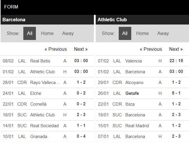 Thống kê phong độ Barcelona vs Athletic Bilbao