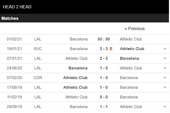 Thống kê đối đầu Barcelona vs Athletic Bilbao