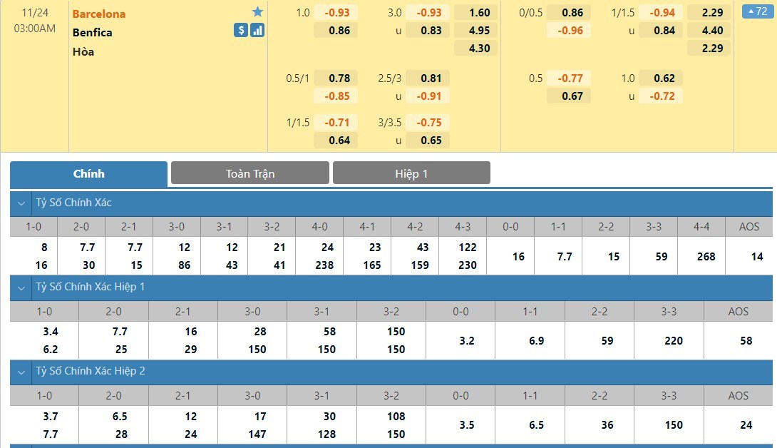 Tỷ lệ kèo cá cược bóng đá trực tuyến trận Barcelona vs Benfica