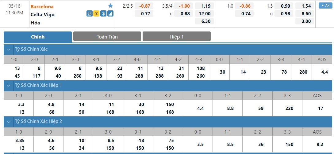 Tỷ lệ kèo cá cược bóng đá trực tuyến trận Barcelona vs Celta Vigo