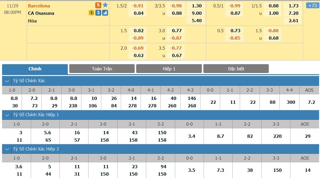 Tỷ lệ kèo cá cược bóng đá trận Barcelona vs Osasuna
