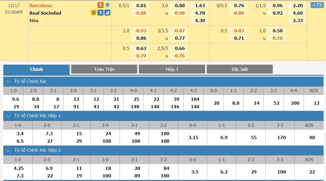 Tỷ lệ kèo cá cược bóng đá trận Barcelona vs Real Sociedad