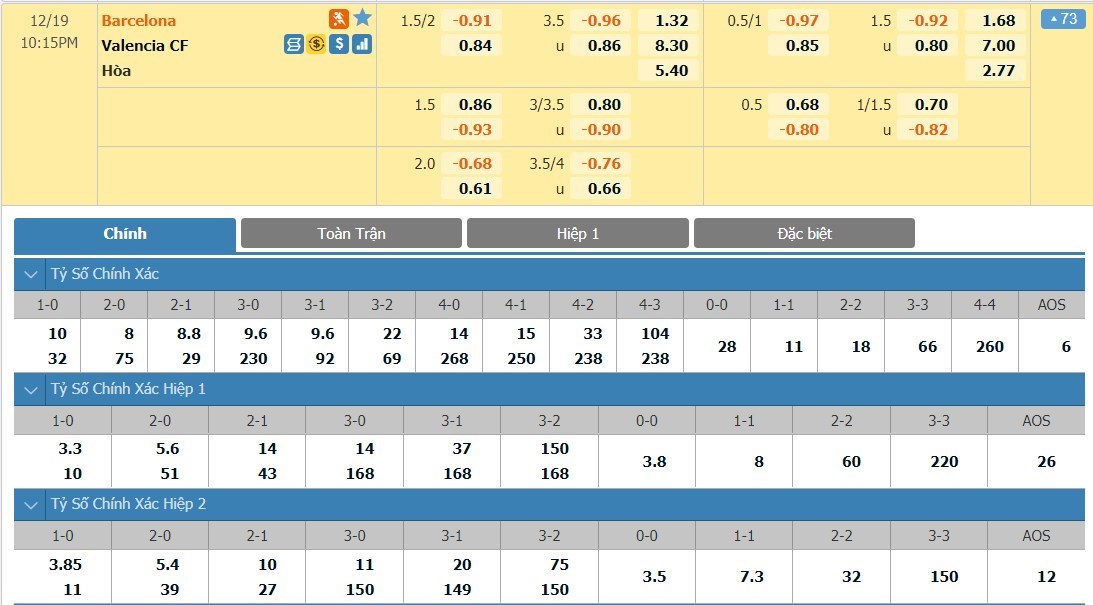 Tỷ lệ kèo cá cược bóng đá trực tuyến trận Barcelona vs Valencia