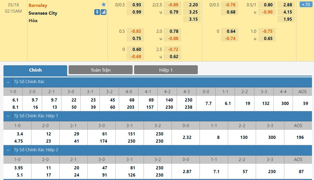Tỷ lệ kèo cá cược bóng đá trực tuyến trận Barnsley vs Swansea City