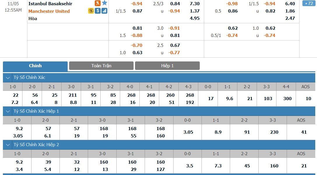 Tỷ lệ kèo cá cược bóng đá trận Basaksehir vs Manchester United
