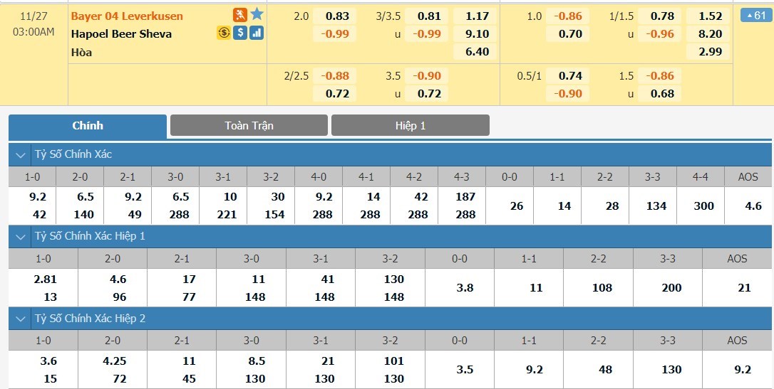 Tỷ lệ kèo cá cược bóng đá trực tuyến trận Bayer 04 Leverkusen vs Hapoel Be'er Sheva