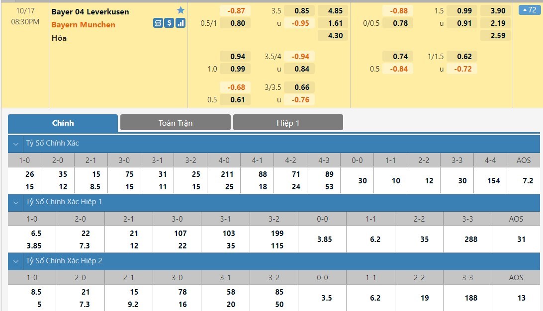 Tỷ lệ kèo cá cược bóng đá trực tuyến trận Bayer Leverkusen vs Bayern Munich