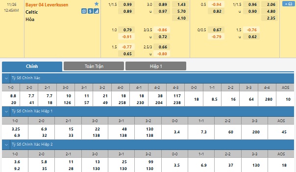 Xem tỉ lệ kèo cá cược bóng đá trực tuyến Bayer Leverkusen vs Celtic