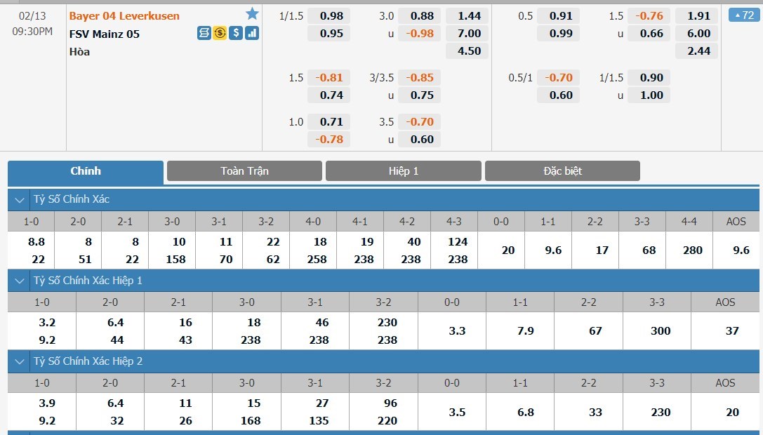 Tỷ lệ kèo cá cược bóng đá trận Bayer Leverkusen vs Mainz 05