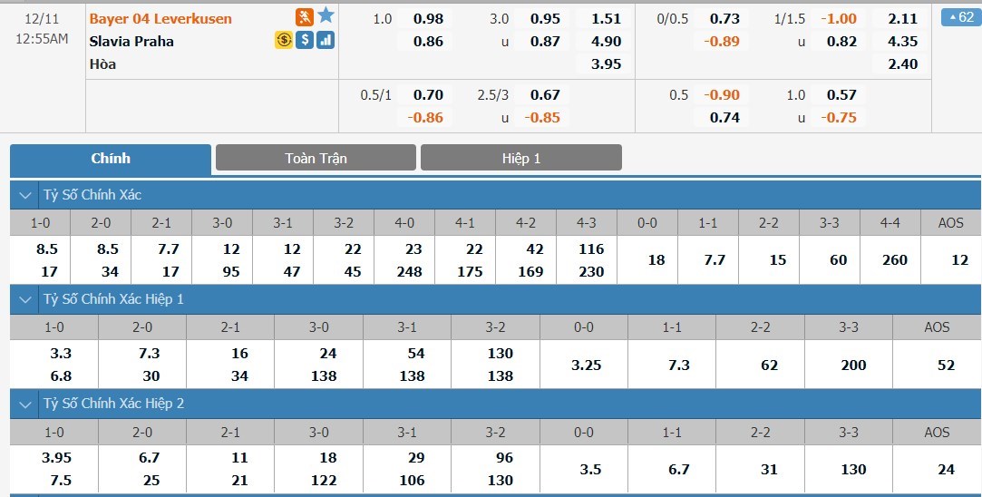 Xem tỷ lệ kèo cá cược bóng đá trực tuyến Bayer Leverkusen vs Slavia Praha