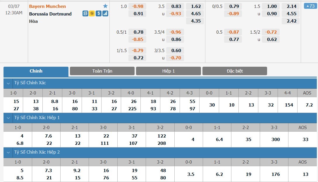 Tỷ lệ kèo cá cược bóng đá trận Bayern Munich vs Borussia Dortmund