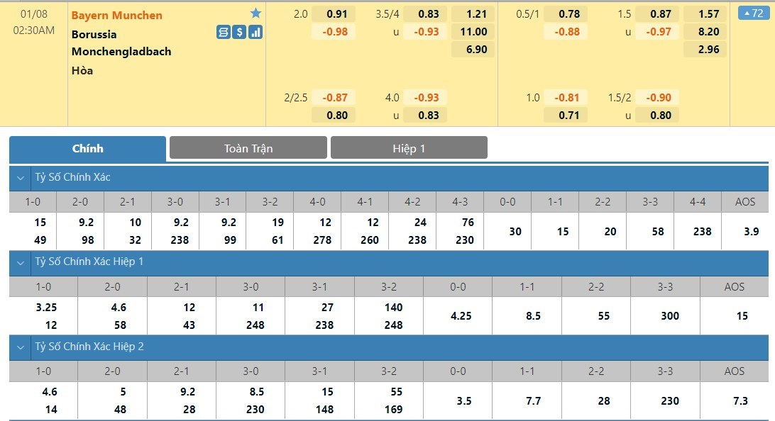 Tỷ lệ kèo cá cược bóng đá trực tuyến trận Bayern Munich vs Borussia M.Gladbach