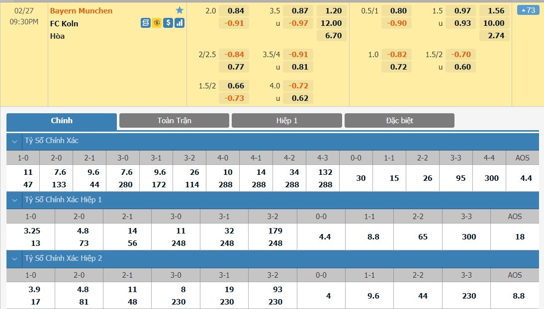 Tỷ lệ kèo cá cược bóng đá trận Bayern Munich vs FC Koln