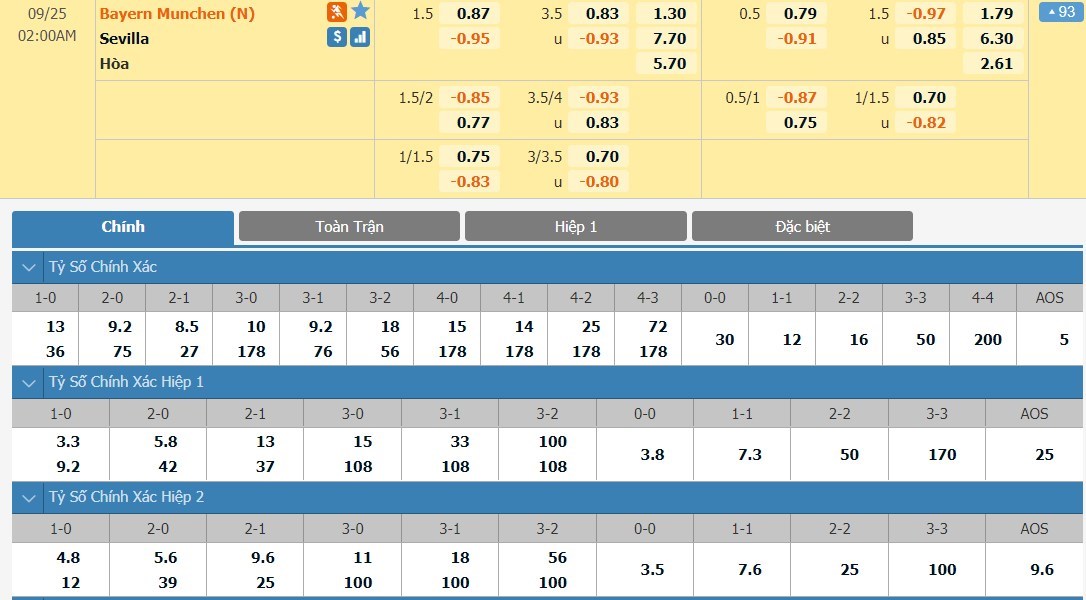 Xem tỷ lệ kèo cá cược bóng đá trực tuyến Bayern Munich vs Sevilla