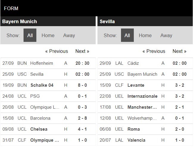 Thống kê phong độ Bayern Munich vs Sevilla