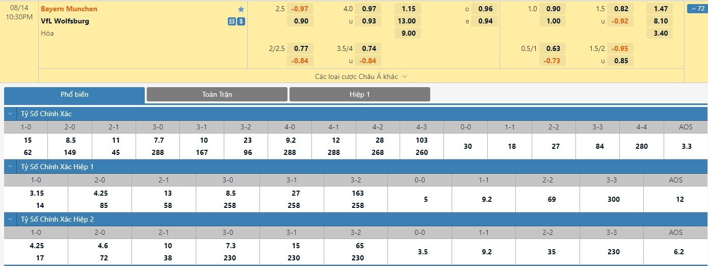 Tỷ lệ kèo cá cược bóng đá trực tuyến trận Bayern Munich vs Wolfsburg
