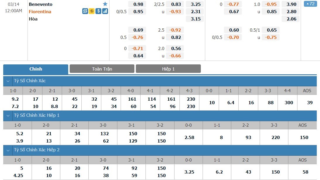 Tỷ lệ kèo cá cược bóng đá trận Benevento vs Fiorentina